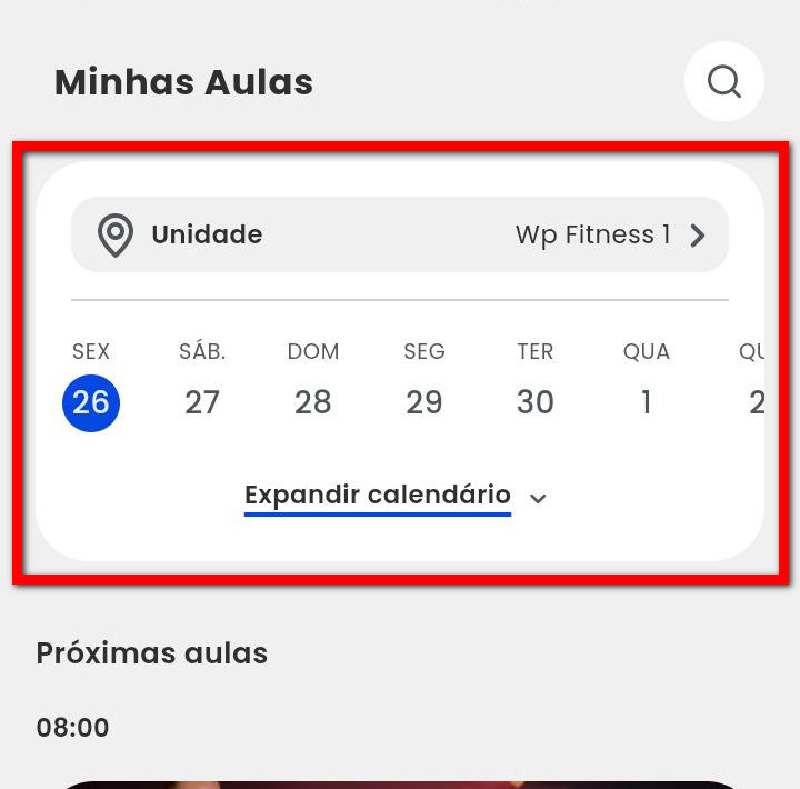 2.1. Pode buscar a aula pela unidade cadastrada, clicando em "Unidade" pode buscar pelo dia clicando sobre o calendário.