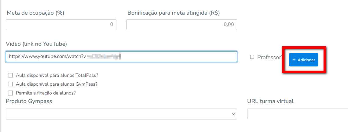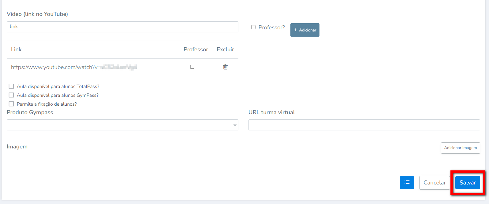 4. Será apresentada a tela de edição da aula coletiva, localize a opção "Vídeo (link no YouTube)" e informe o link desejado;
