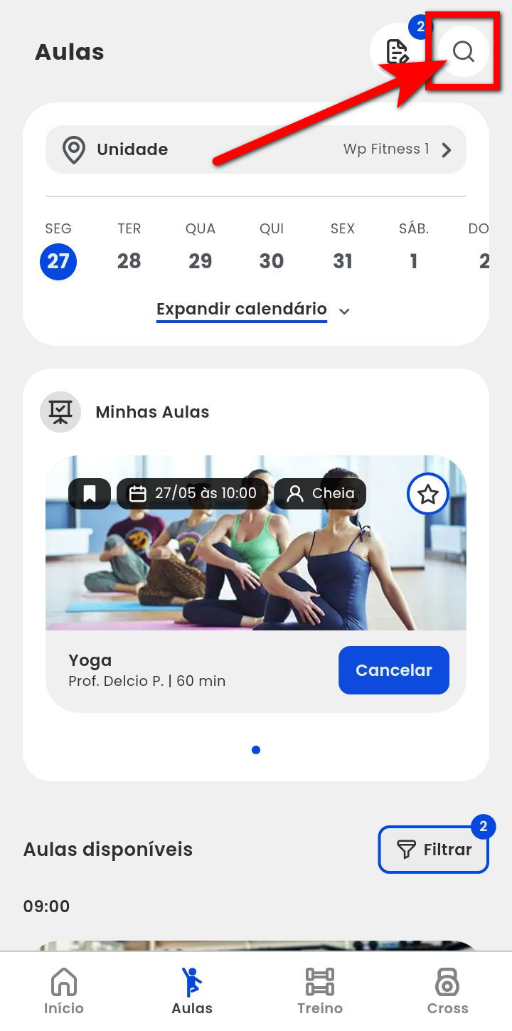 2. Para realizar a busca da aula pode utilizar o ícone informando o nome da aula;