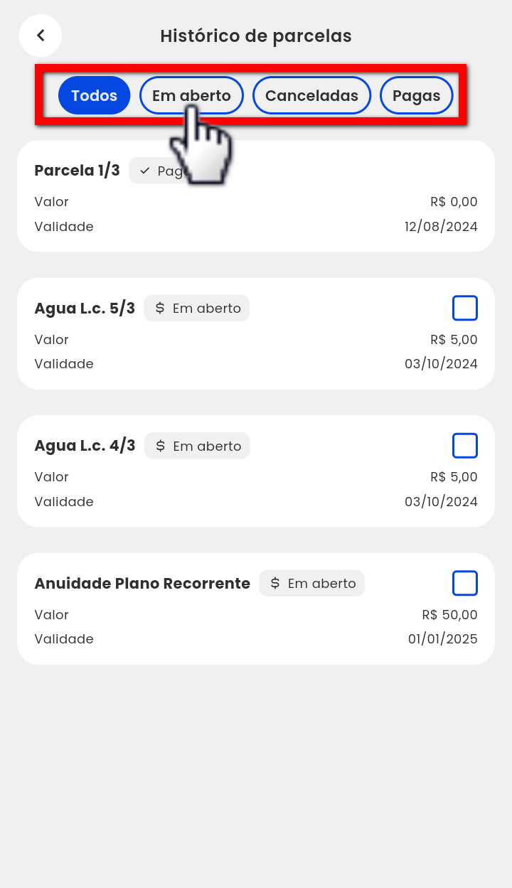 4.2. Utilize os filtros para visualizar apenas as parcelas "Em aberto";