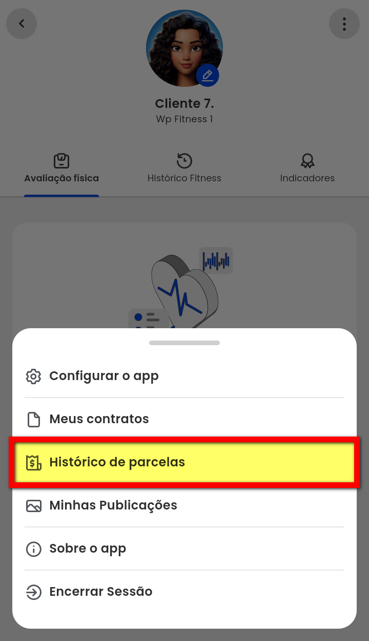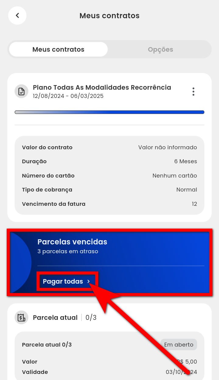Quando o aluno possui parcelas em aberto ou vencidas, ele pode realizar o pagamento diretamente pelo App Treino, de forma simples e prática.