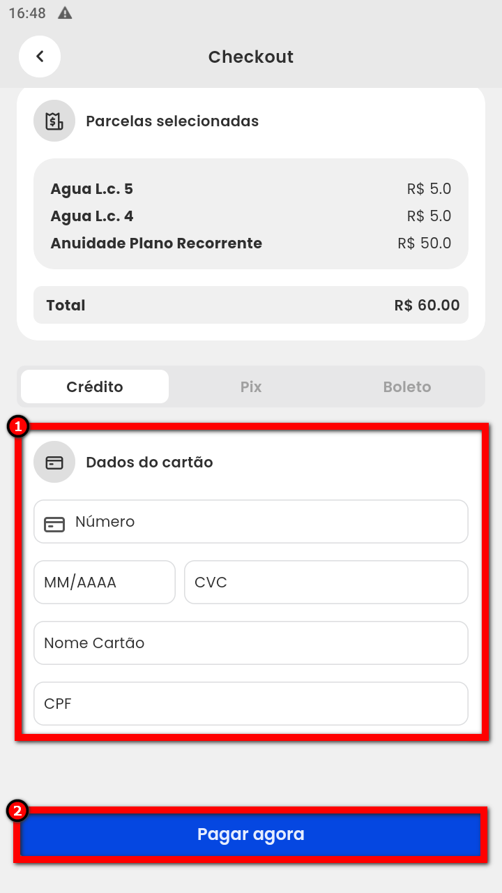 7.1. Caso o aluno selecione o modelo de pagamento Crédito, basta preencher os dados do cartão e, em seguida, clicar em "Pagar Agora";