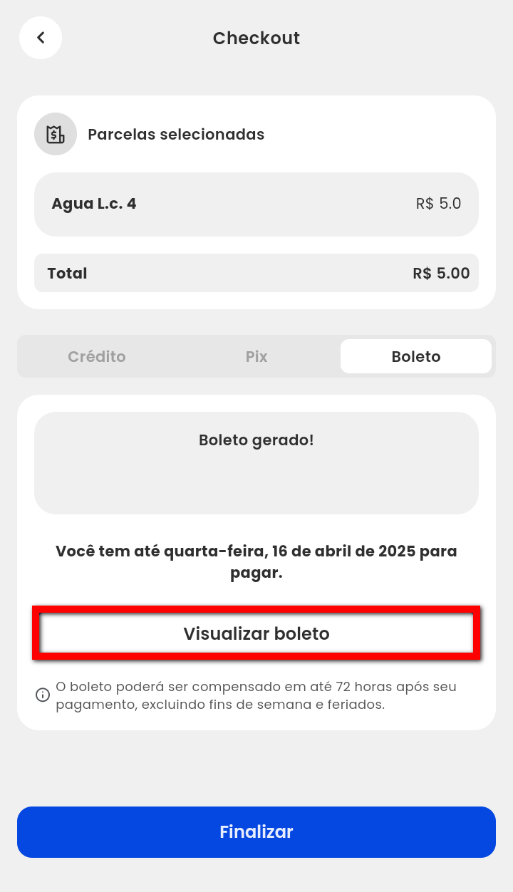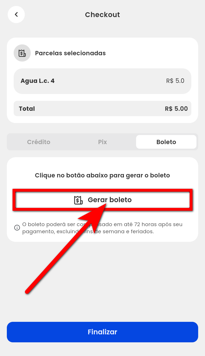 6. Na tela de checkout, serão apresentadas algumas informações, como a descrição e o valor das parcelas selecionadas ou vencidas. O sistema também exibe o valor total do pagamento que será realizado;