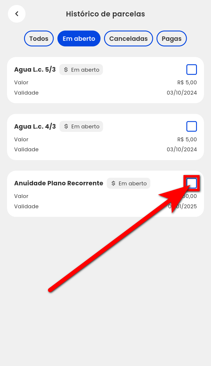 4.3. Marque o checkbox para selecionar a parcela ou parcelas que deseja pagar;