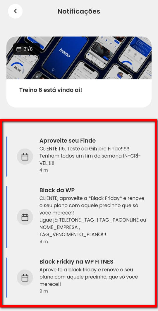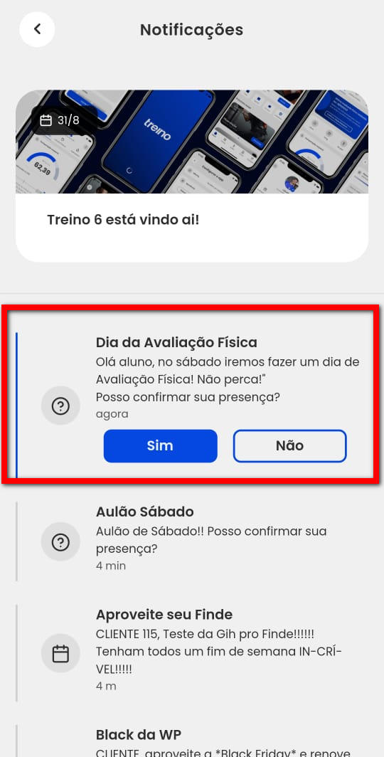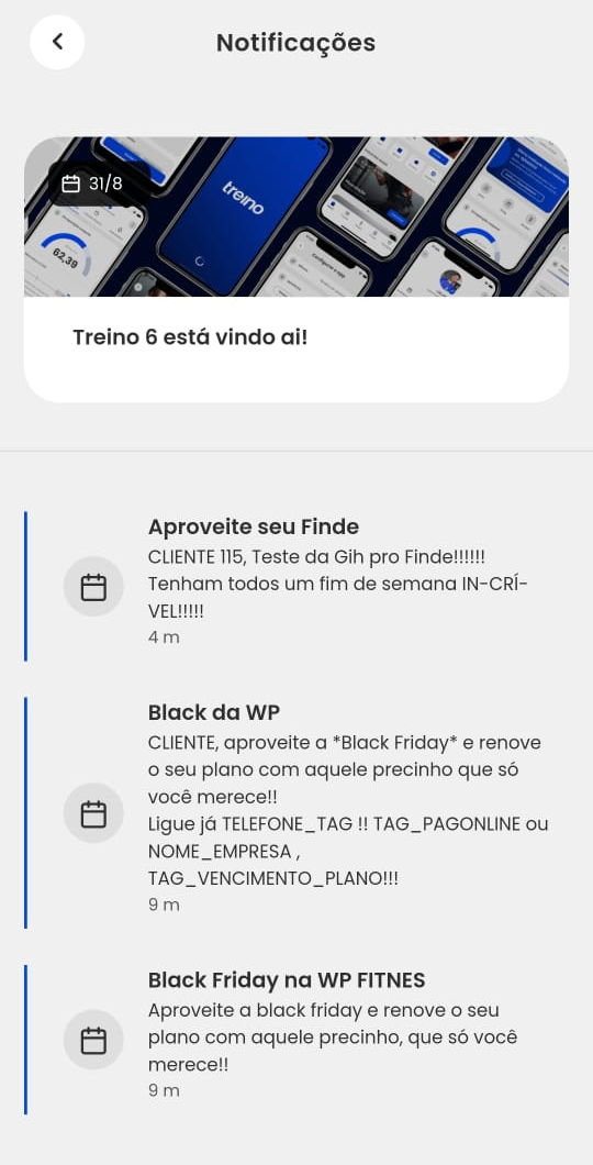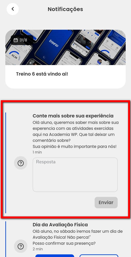 2. Em seguida, são apresentadas as informações referente as novidades do App Treino 6, e abaixo as mensagens enviadas para o aluno;