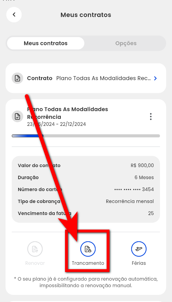 É possível o próprio aluno trancar o plano diretamente pelo App Treino. Lembrando que através do aplicativo, somente alunos conseguem trancar.