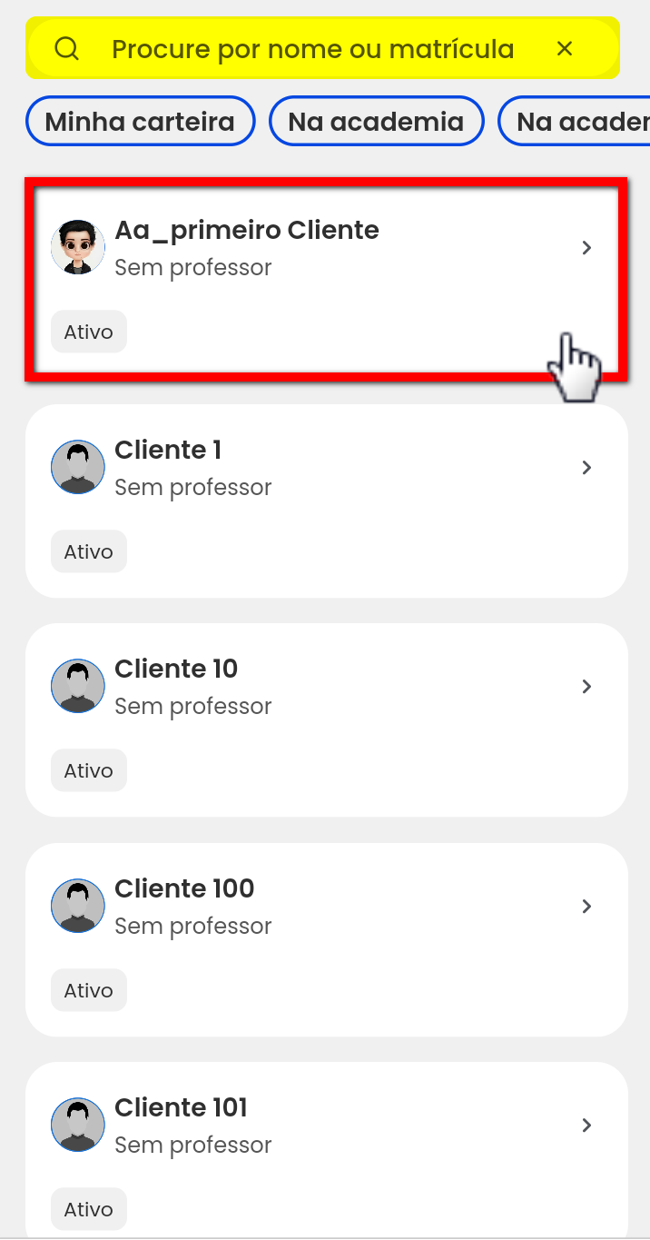 2. Busque pelo nome/matrícula do aluno que deseje criar uma nova ficha de Treino;