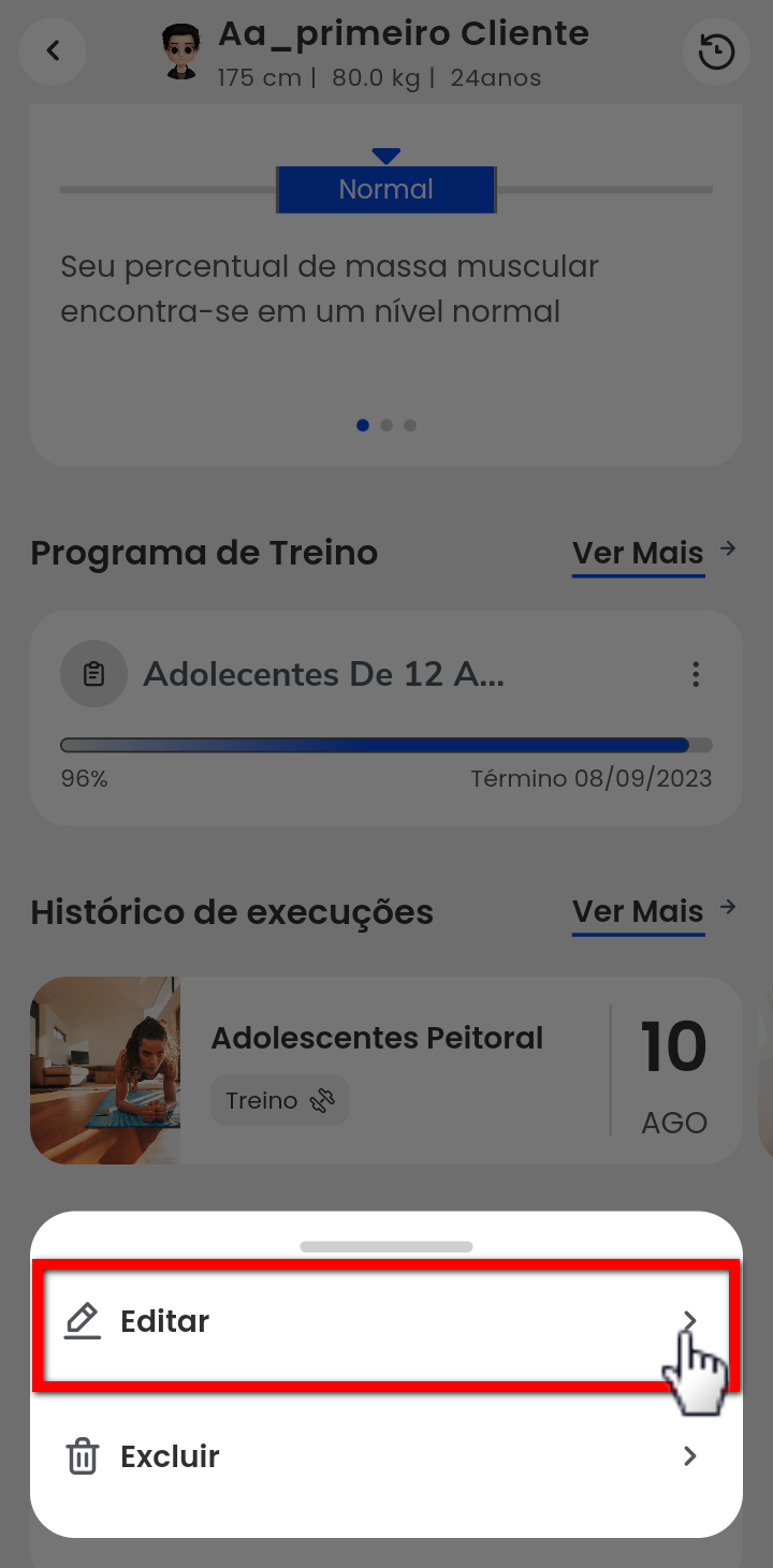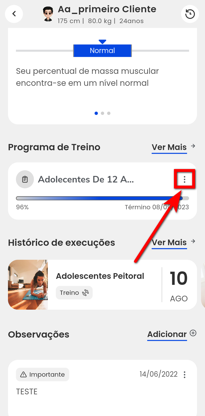 3. Após isso, a tela de perfil do aluno será apresentada. Localize o campo "Programa de treino" e, em seguida, clique no ícone de três pontos ao lado do programa de treino desejado;