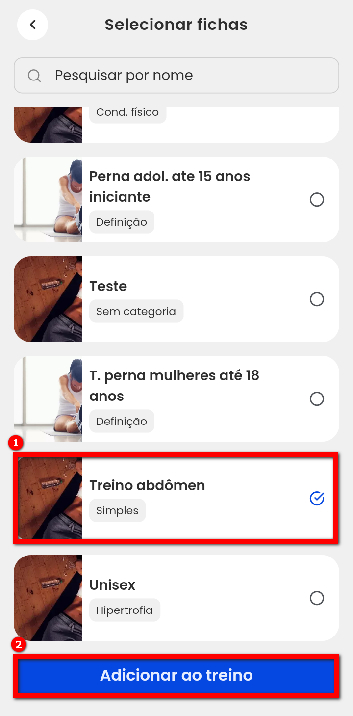 7. Selecione a ficha conforme desejado e clique em “Adicionar ao treino“;