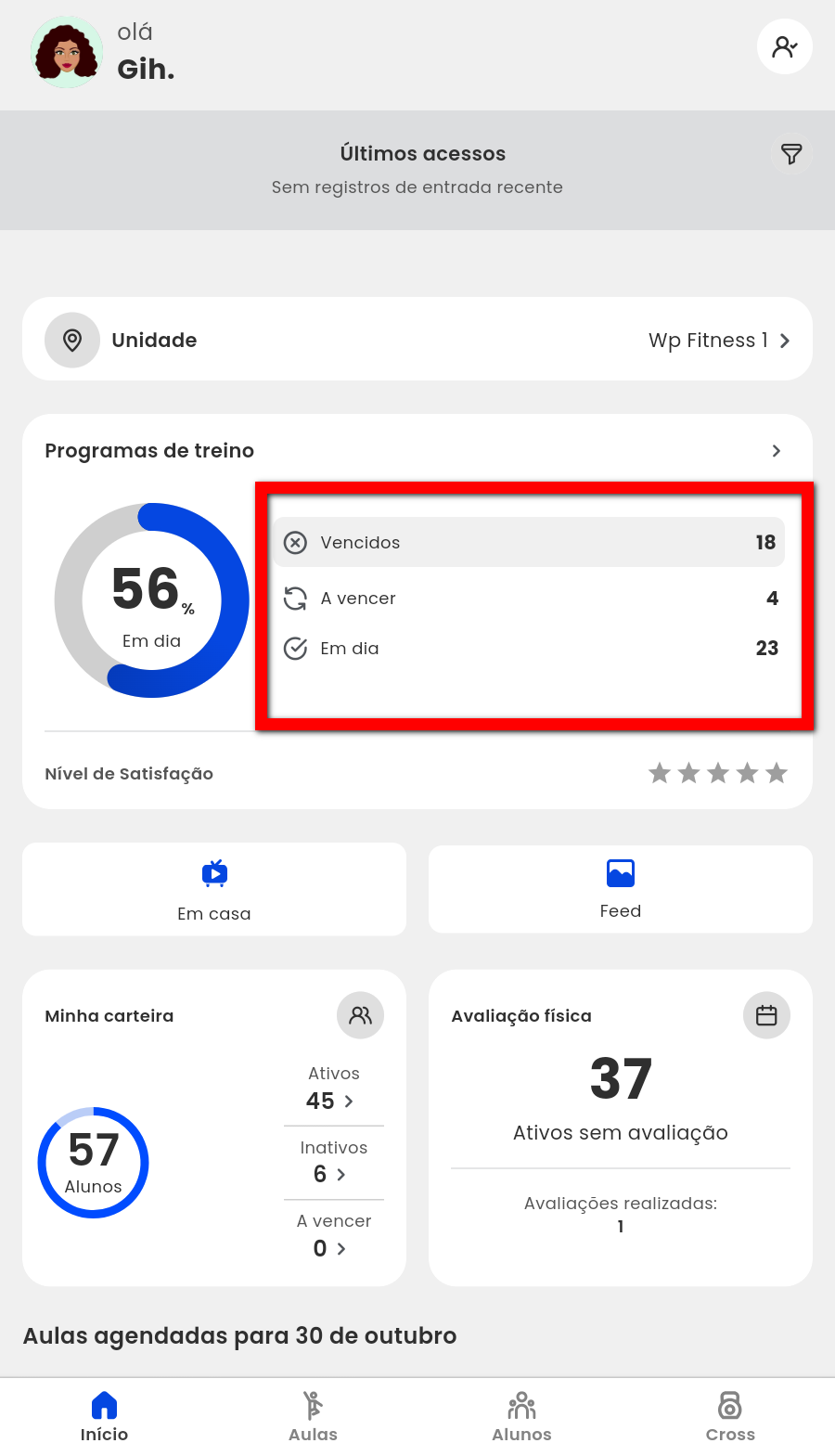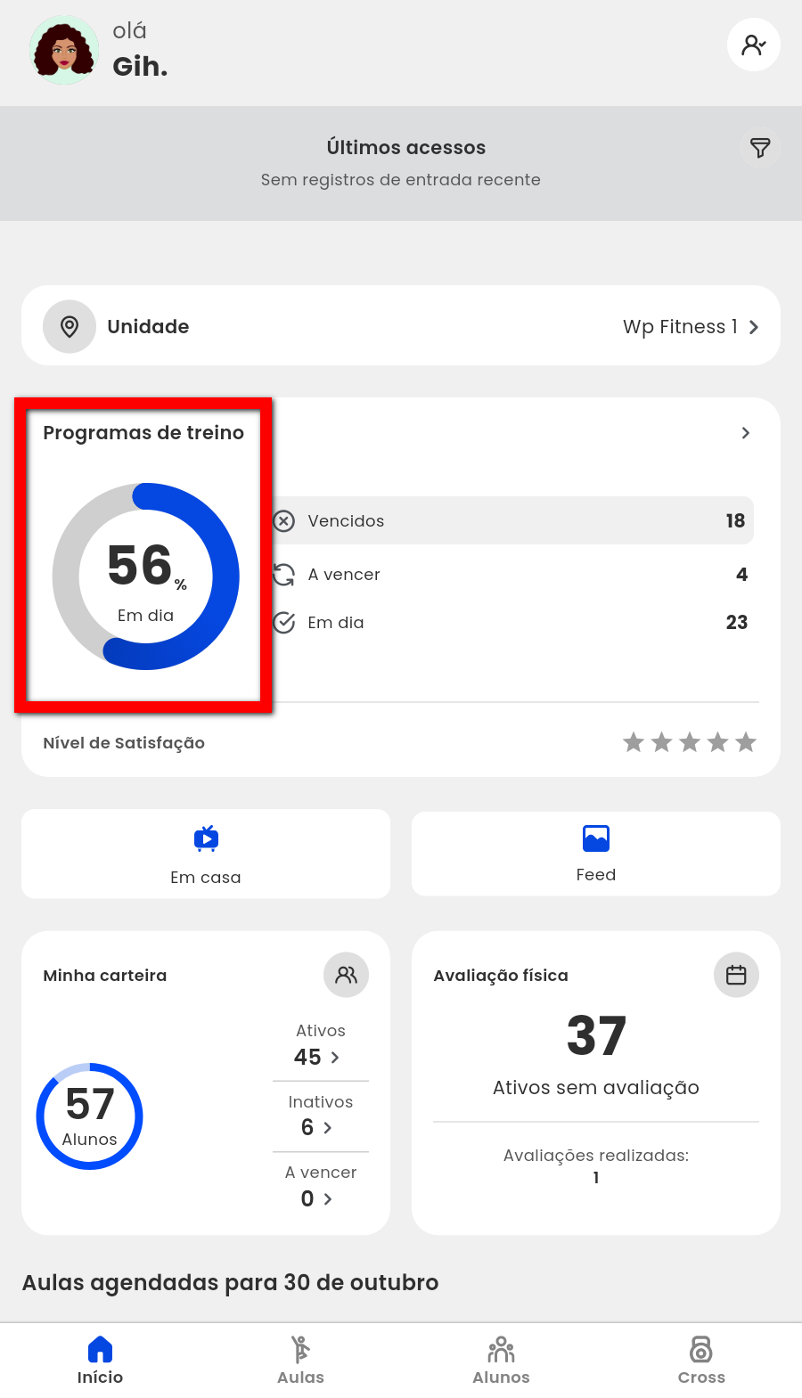 1. No dashboard “Programas de Treino” em “Revisados“, a porcentagem mostra os treinos que foram revisados, se for 100% indica que não existe nenhum treino para revisar e que os alunos estão com treinos em dia;