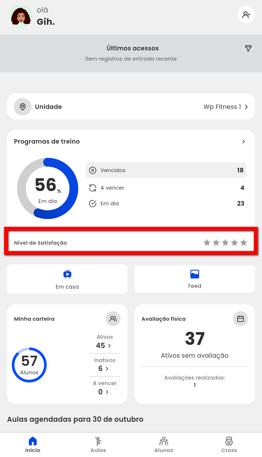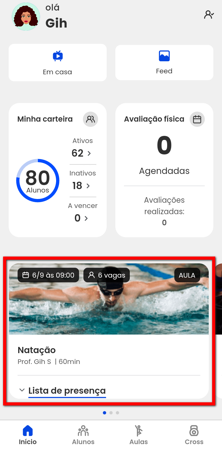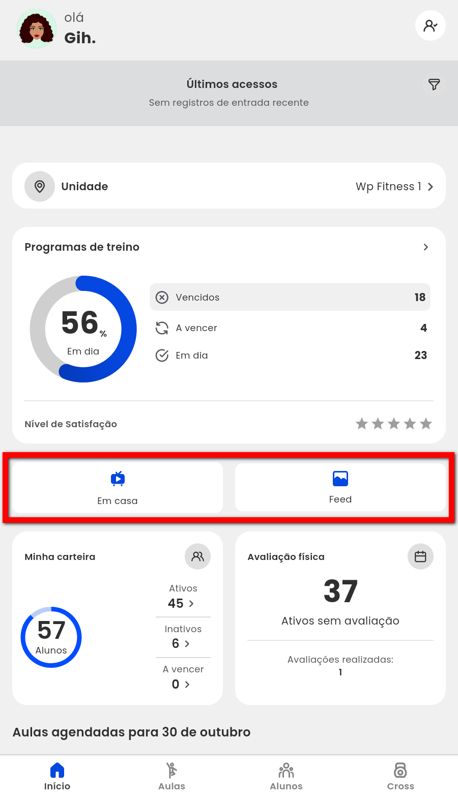 2. Na opção "Em casa", são apresentados todos os treinos online configurados, e na opção "Feed", é possível visualizar todos os posts publicados;