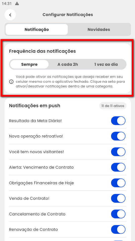 3. Na guia "Notificações", no bloco "Frequência das notificações" pode definir com que frequência deseja ver as notificações se é sempre, a cada 2 horas ou 1 vez ao dia;