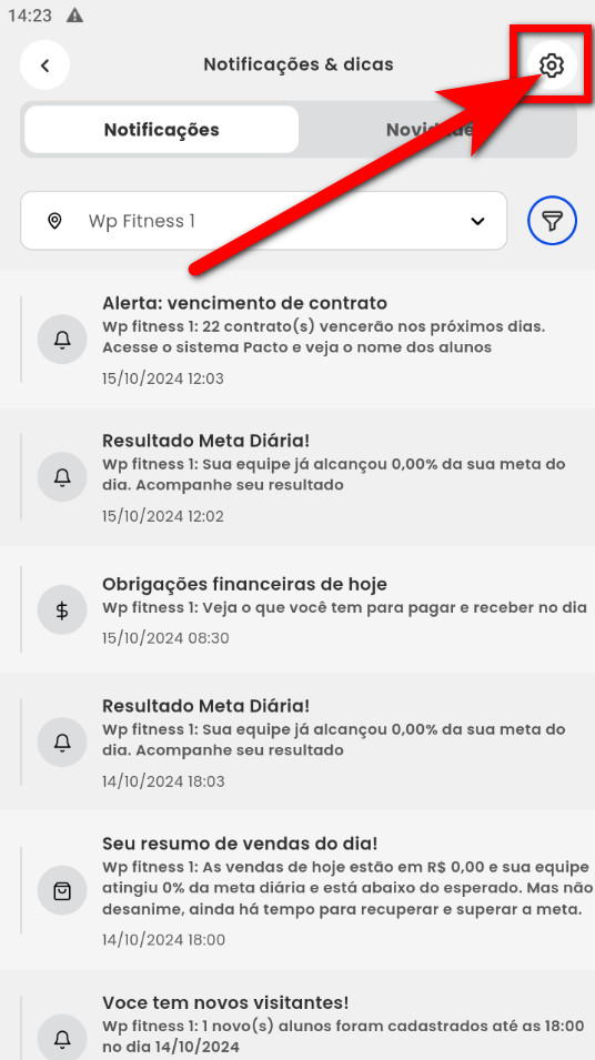 2. Em seguida, será apresentada a tela de notificações, clique no ícone de engrenagem;