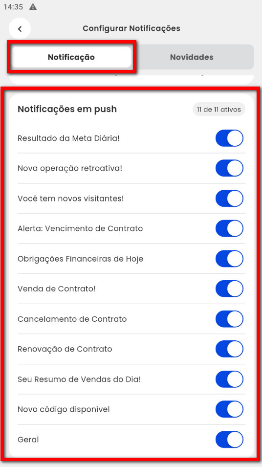4. Agora, você pode configurar os tipos de alertas que deseja receber, sua frequência e também optar por receber as principais novidades do sistema;