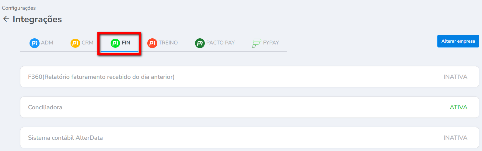 Na tela de Integração do módulo Financeiro estão centralizadas todas as integrações que estão disponíveis de configuração.