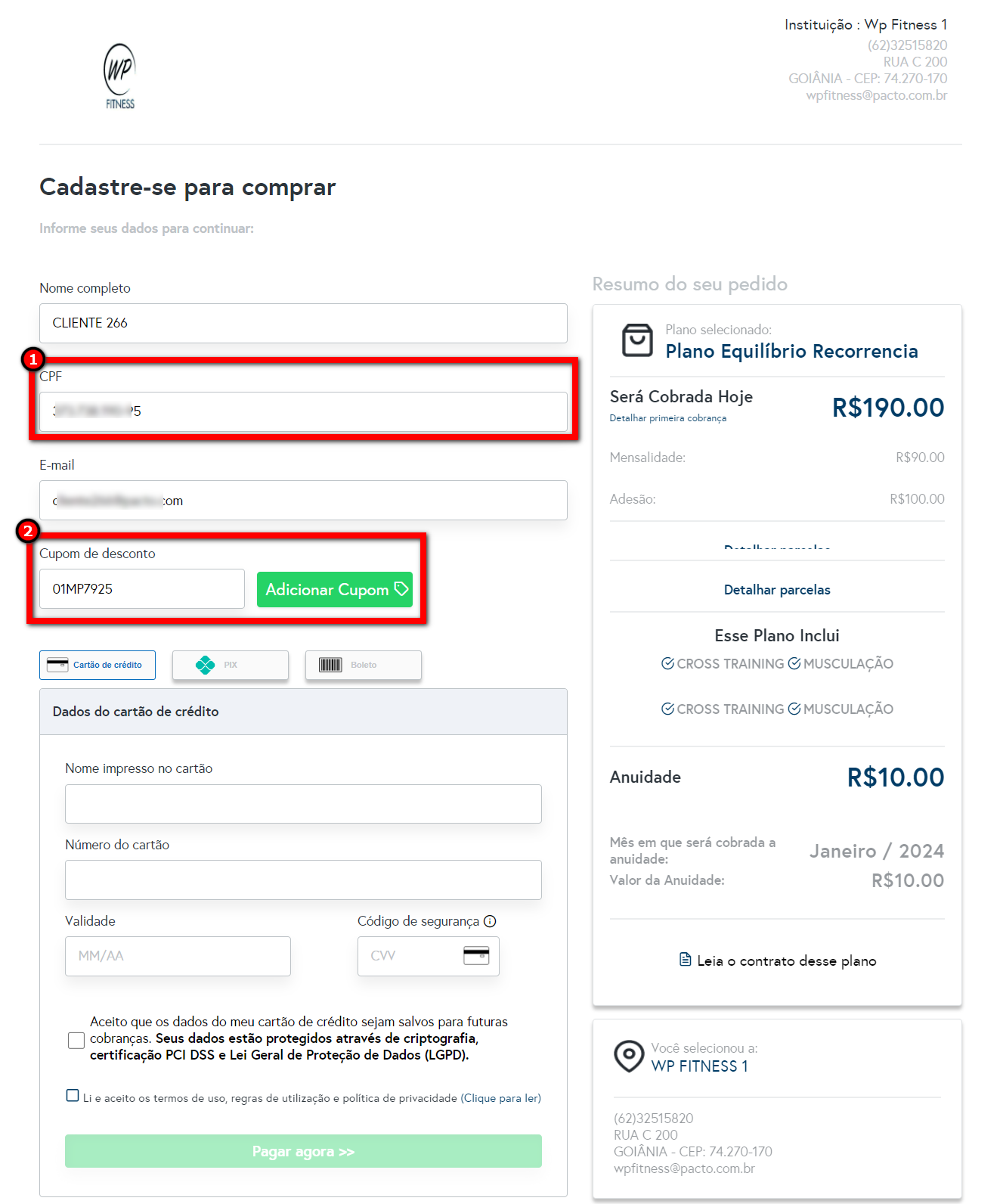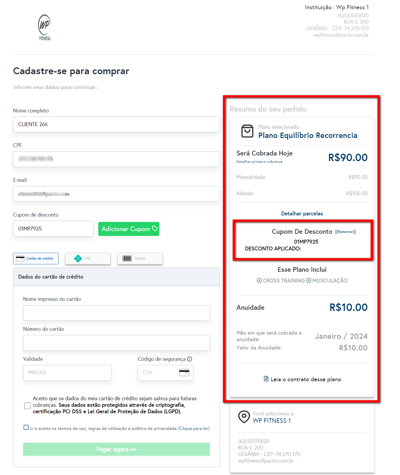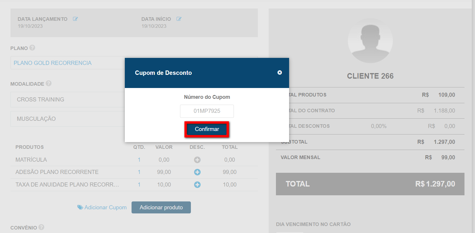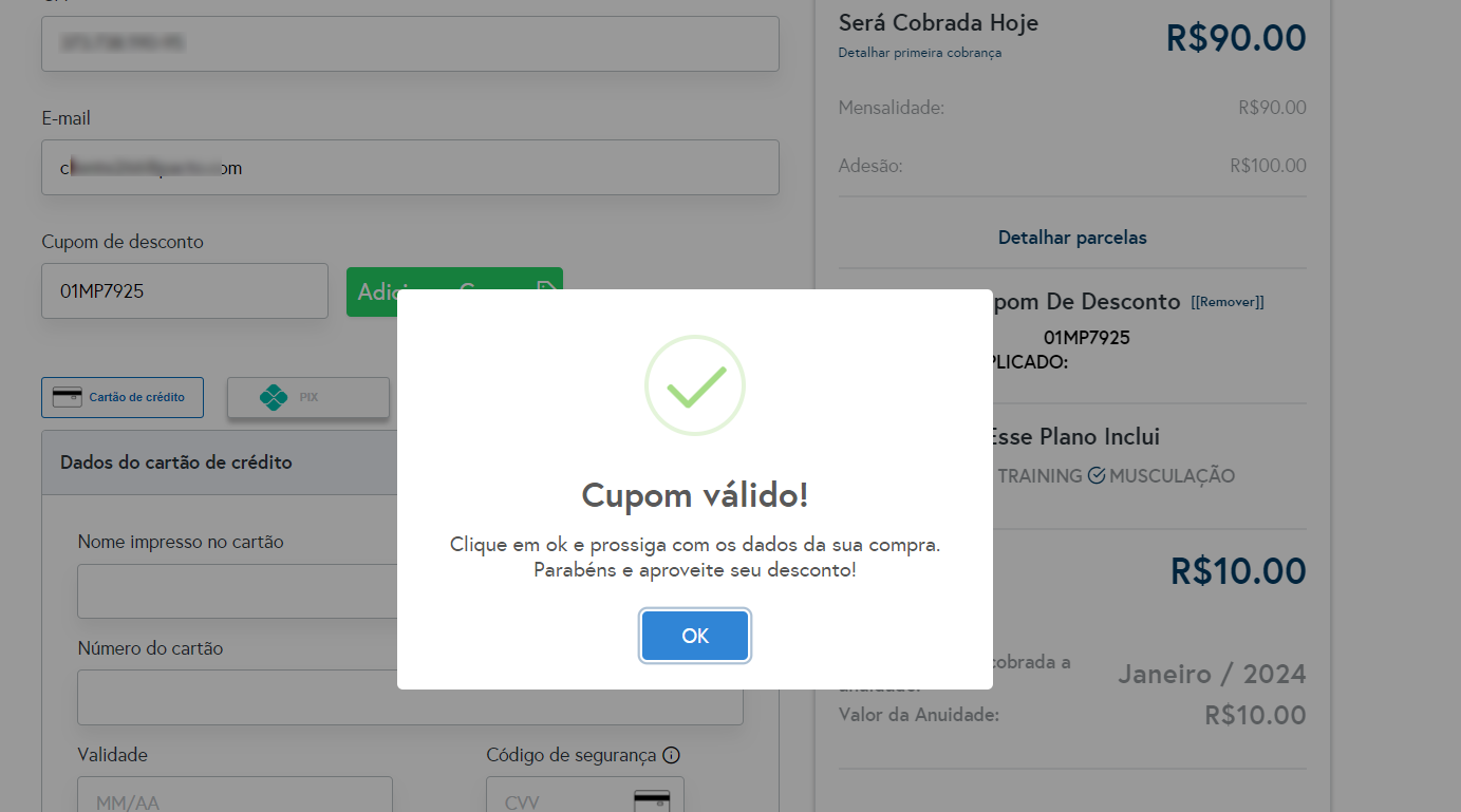 2. Logo no campo "Cupom de desconto" ele deverá incluir o cupom informado e clicar em "Adicionar Cupom";