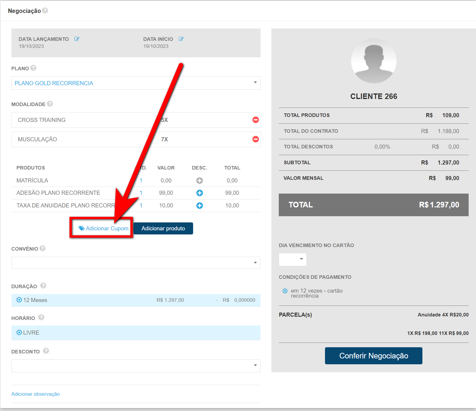 1. Assim que localizado o perfil do convidado e estiver na tela de negociação, o colaborador vai localizar e clicar sobre "Adicionar Cupom";