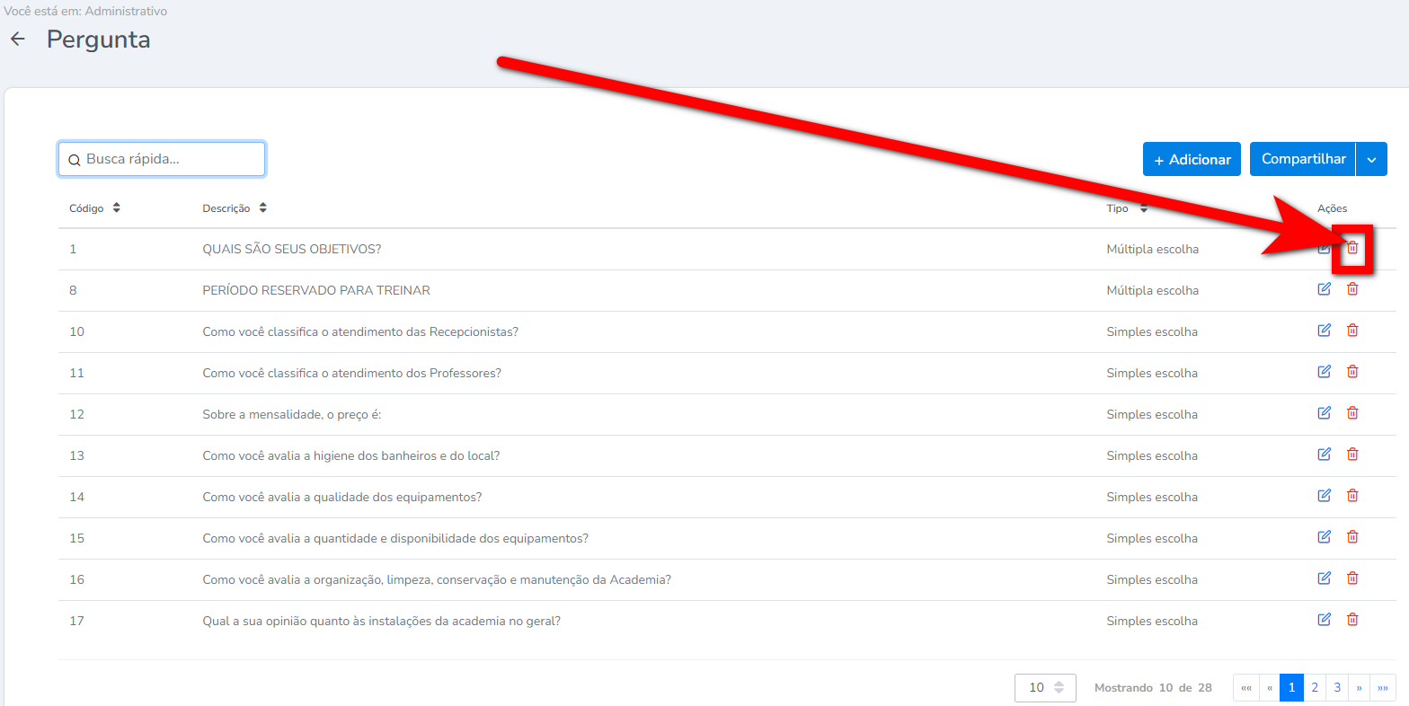 2. Na tela de "Pergunta", localize a pergunta que deseja realizar a exclusão. Na coluna "Ações", localize e clique no ícone para excluir a pergunta;
