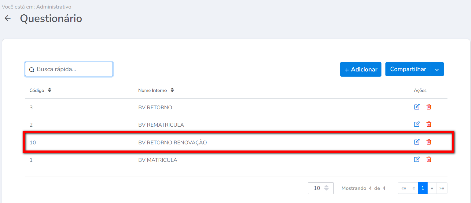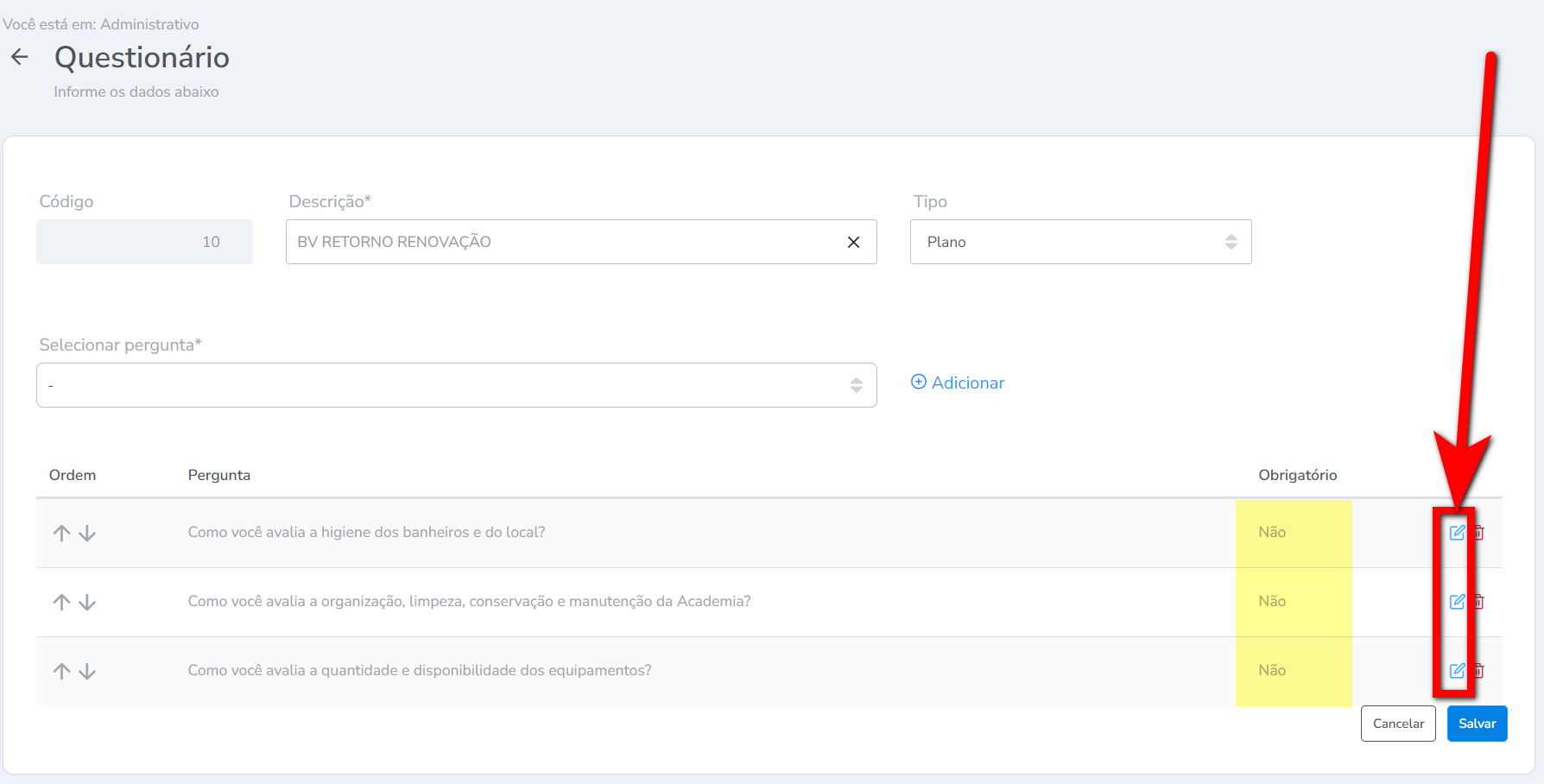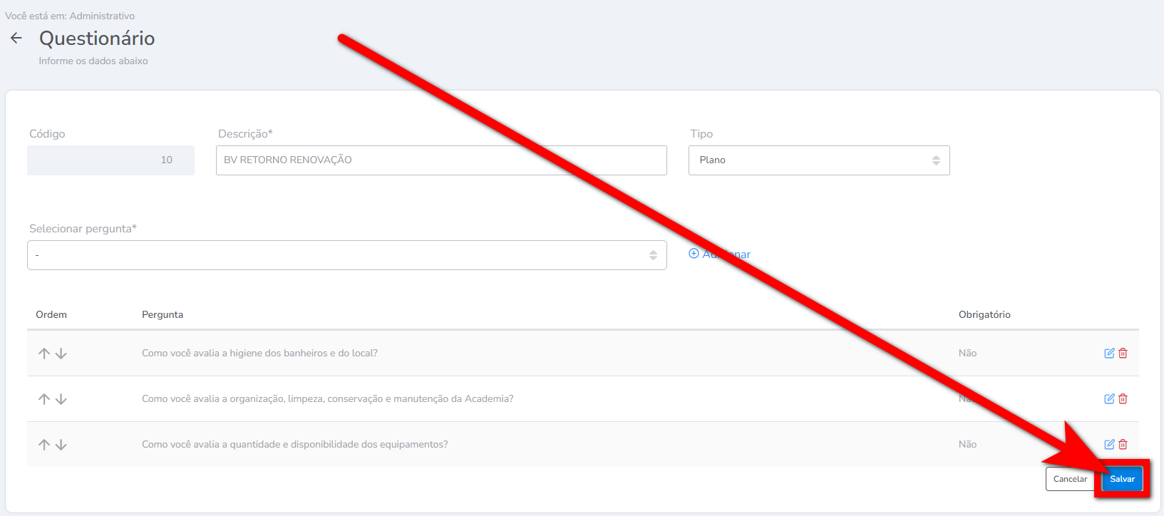 Para saber como cadastrar uma pergunta para o questionário, clique aqui.