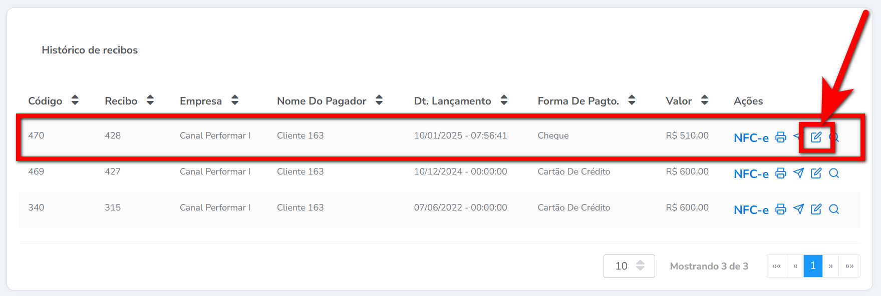5. Será apresentada uma listagem com todos os recebíveis do cliente. Identifique o recebível que será editado, e clique no ícone a sua frente;