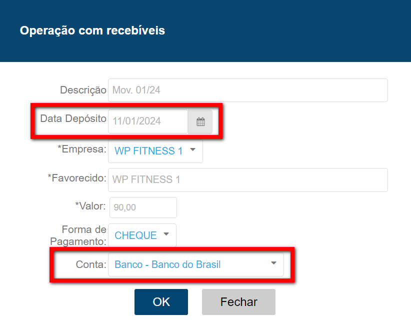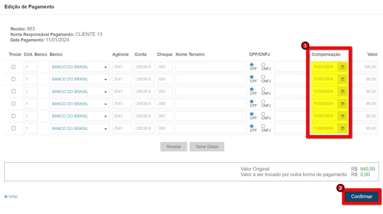 3. Ao apresentar a tela de edição, faça as alterações necessárias na data de compensação dos cheques. Clique em “Confirmar“ para salvar as alterações.