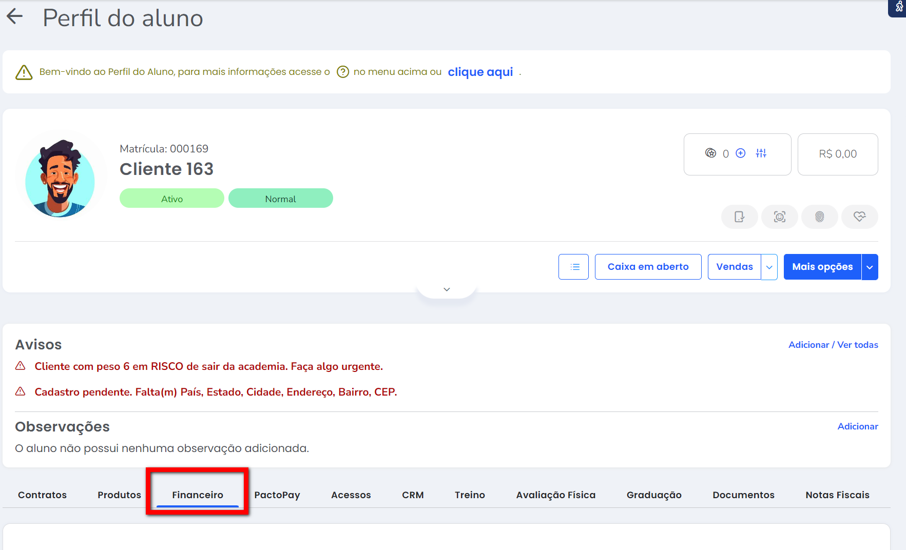 1. No perfil do aluno clique na guia "Financeiro";