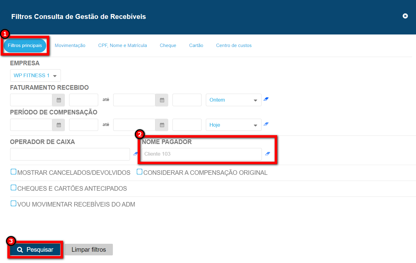 3. Na guia “Filtros principais” localize o campo “Nome Pagador” e informe o nome do cliente que deseja alterar a data de compensação dos cheques. Após, clique em “Pesquisar“;