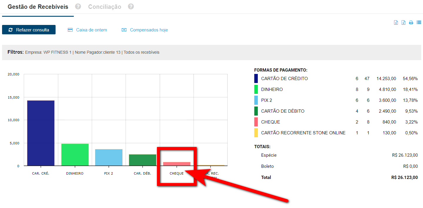 4. Será apresentado um gráfico exibindo o valor total de recebíveis deste cliente divididos por forma de pagamento. Clique sobre a forma de pagamento "cheque";