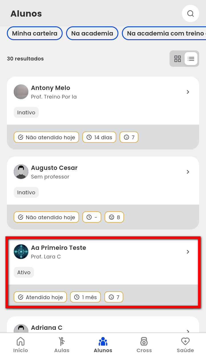 2. Localize e clique sobre o aluno que deseja alterar ou editar o treino;