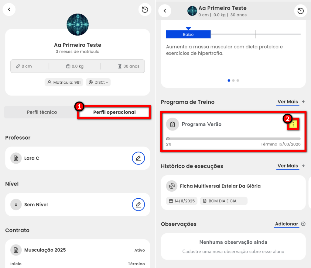 3. Na guia "Perfil operacional", localize o bloco "Programa de Treino" e clique no ícone de edição apresentado no programa que deseja alterar ou editar;