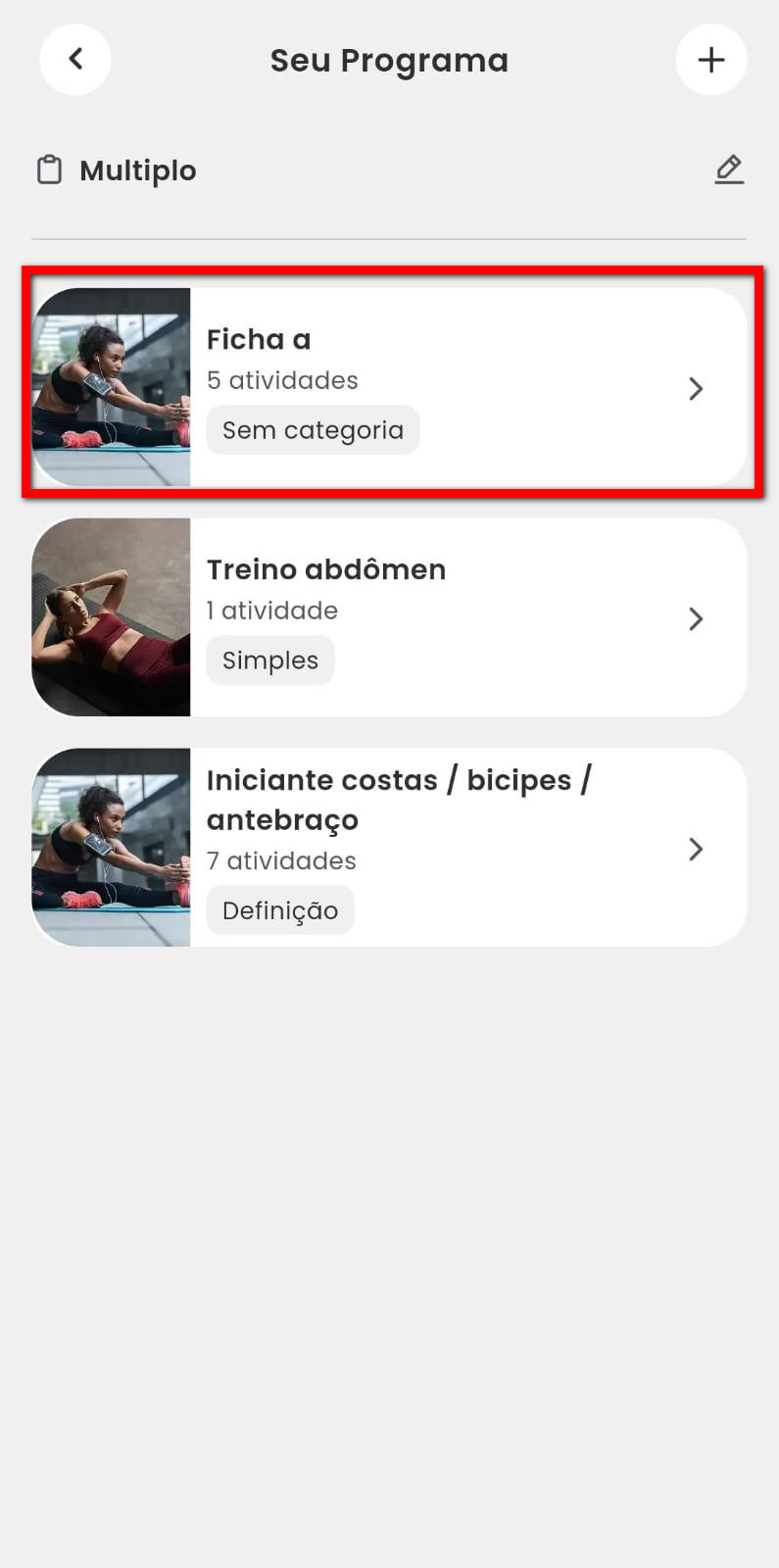 4.2. Para editar alguma informação da ficha de treino, clique sobre a ficha desejada;