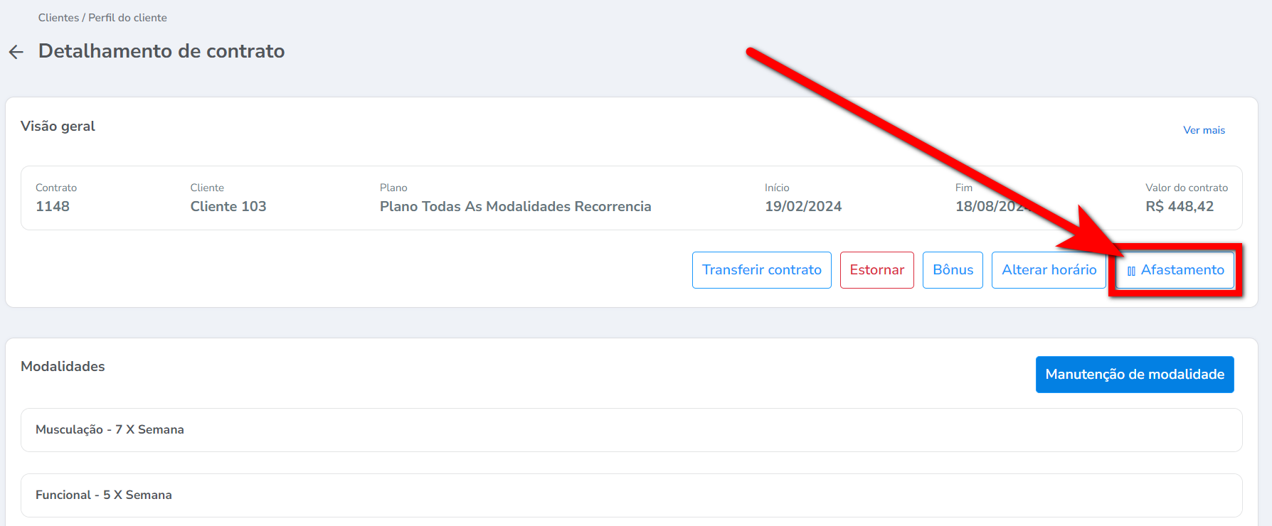 1. Ao acessar o perfil do aluno, na guia “Contratos” localize e clique sobre o plano que deseja lançar o período de férias;