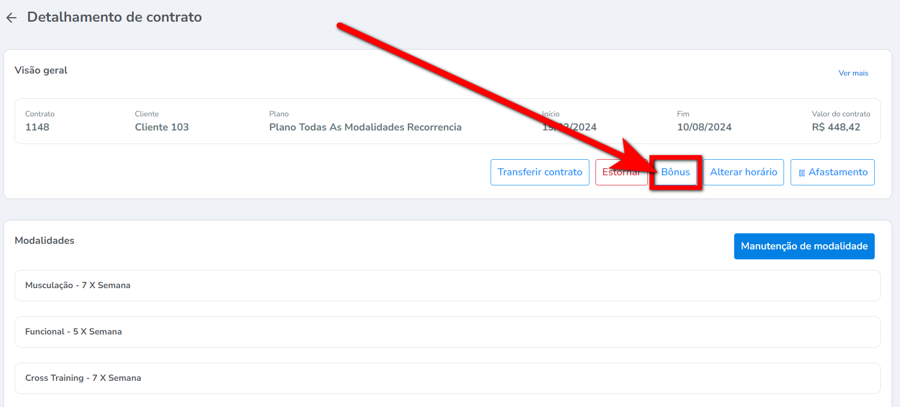 1. Ao acessar o perfil do aluno, na guia “Contratos” localize e clique sobre o plano que deseja lançar o bônus;
