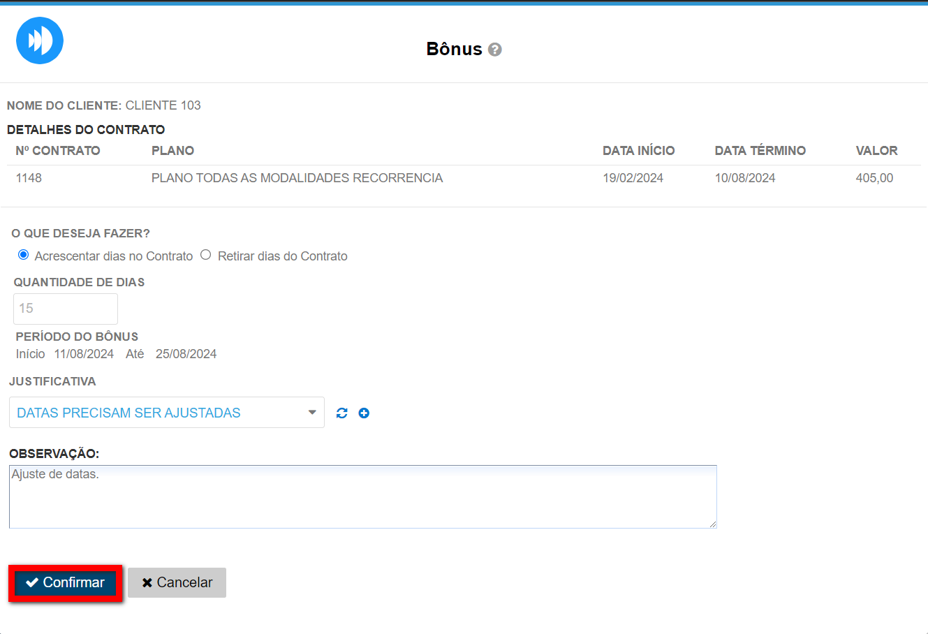 3. Escolha a opção de “Acrescentar dias” ou de “Retirar dias”, informe a quantidade de dias de bônus e uma justificativa. Por fim, clique em “Confirmar“.