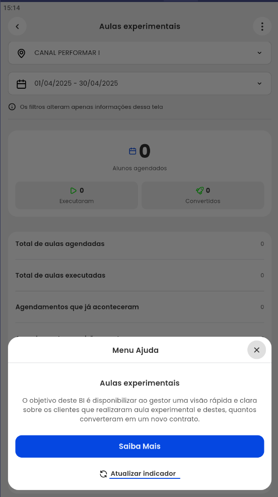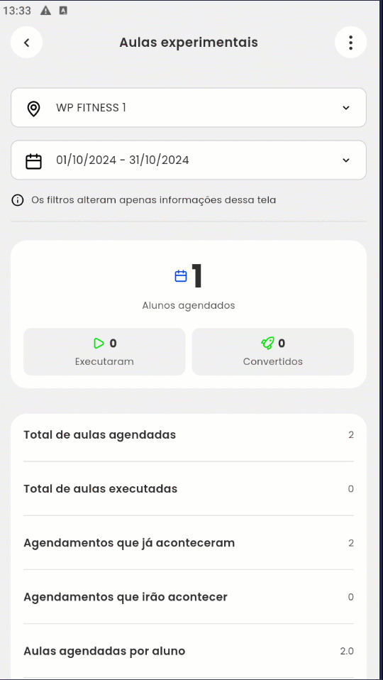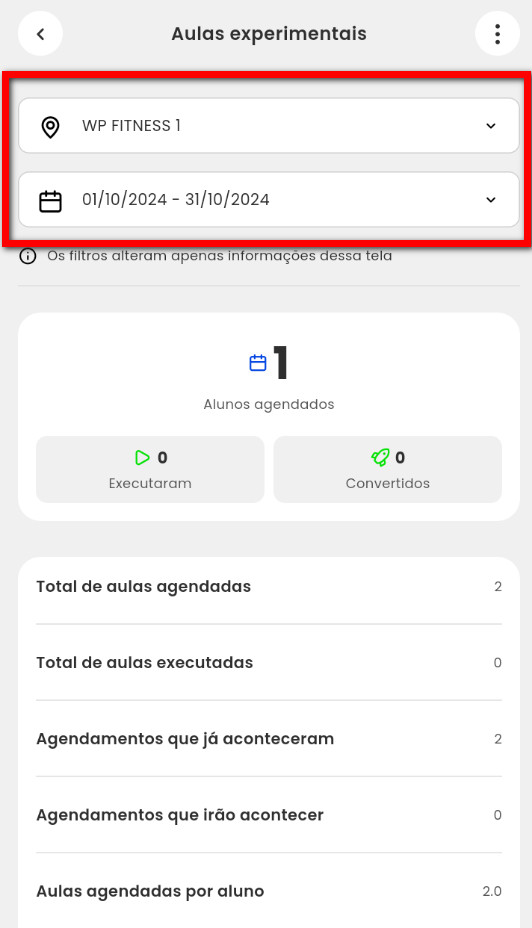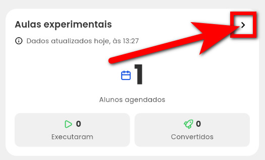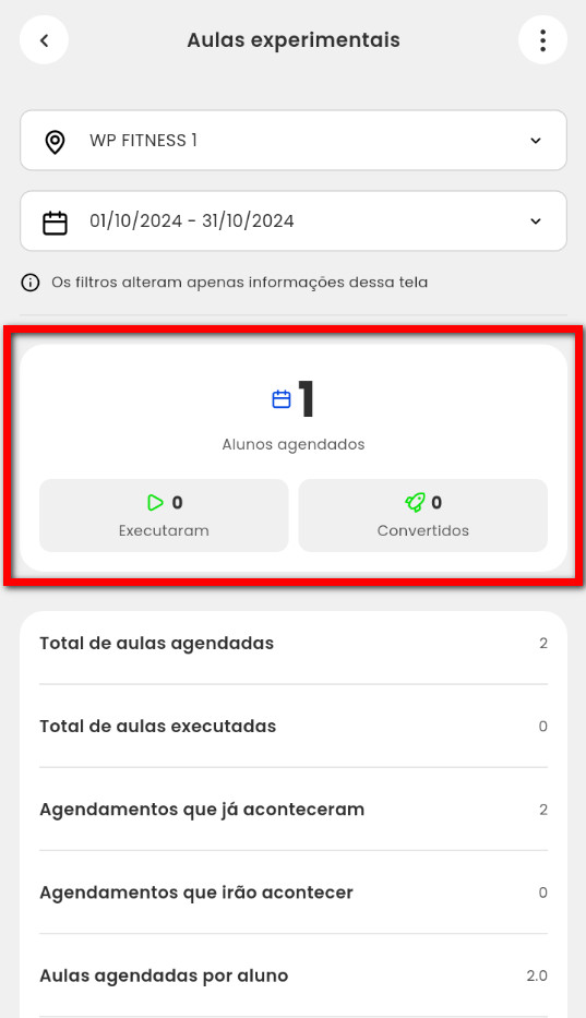- Total de aulas agendadas: será apresentado o total das aulas experimentais agendadas no período informado;