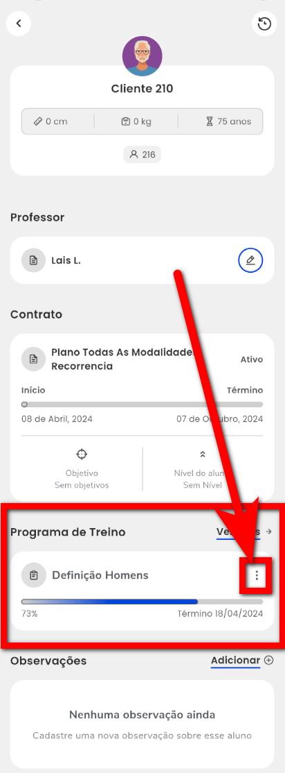 1. Acesse o perfil do aluno no aplicativo e localize o bloco "Programa de Treino";