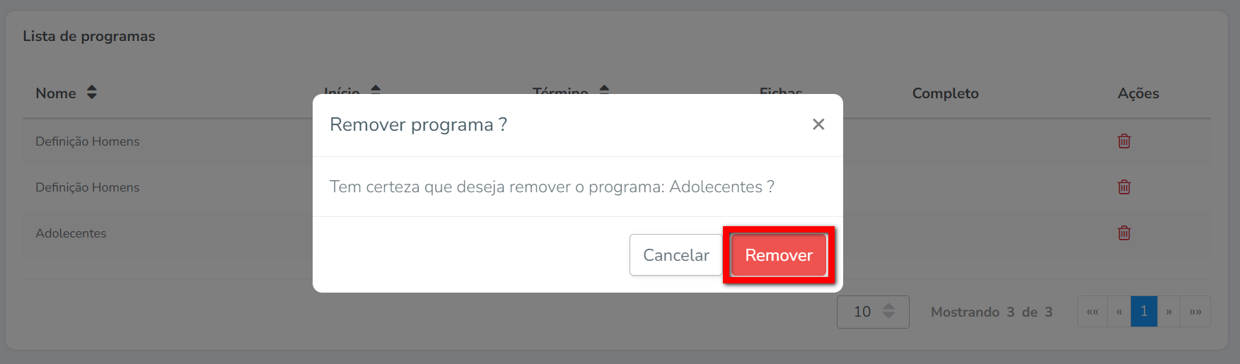 2. Localize o programa de treino que deseja remover e clique no ícone ;