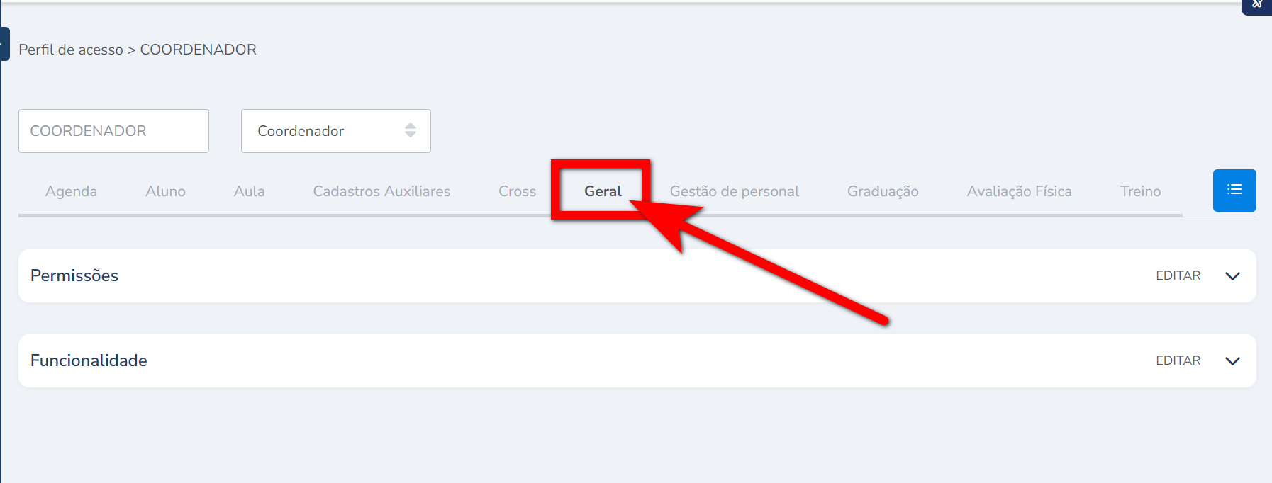 É necessário ter a permissão “Perfil de acesso” habilitada no perfil de acesso do módulo Treino.