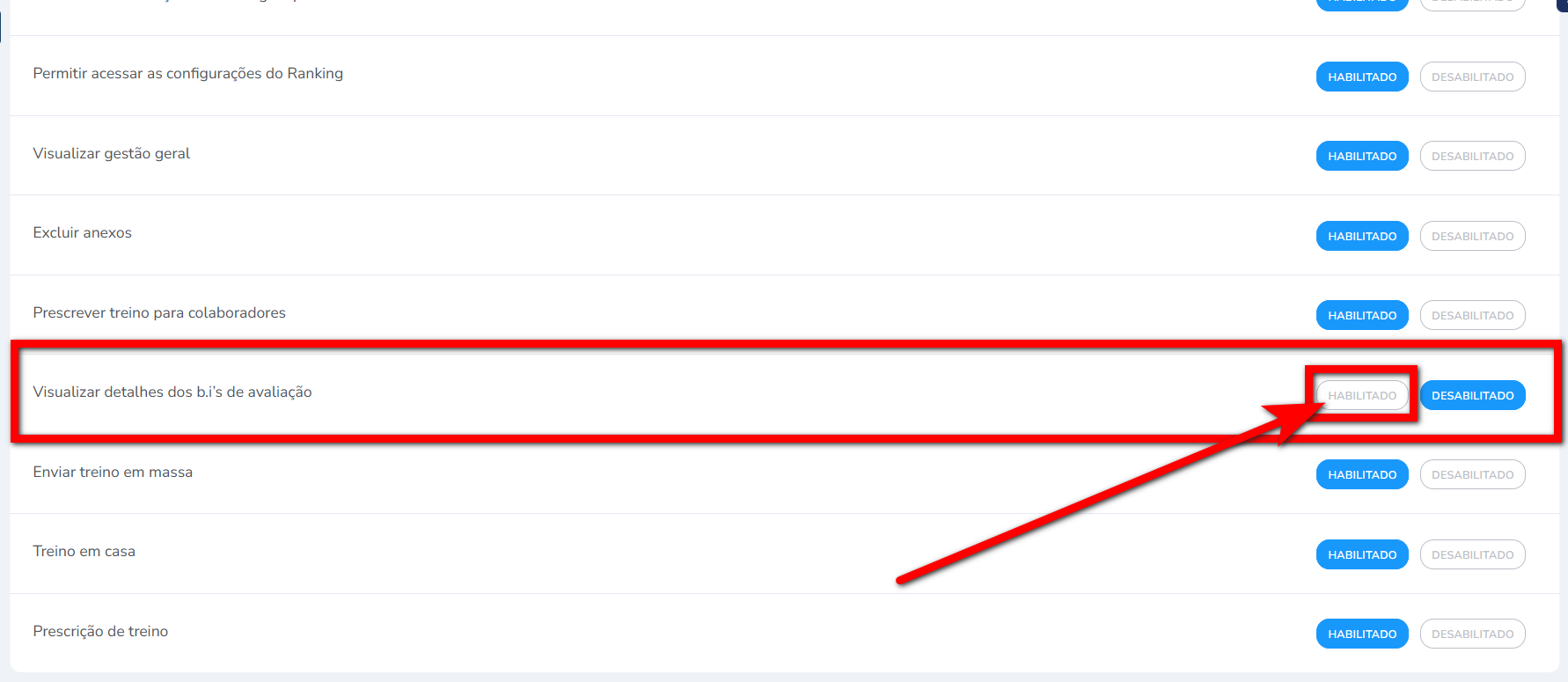 5. Localize e habilite a permissão "Visualizar detalhes dos b.i’s de avaliação”";