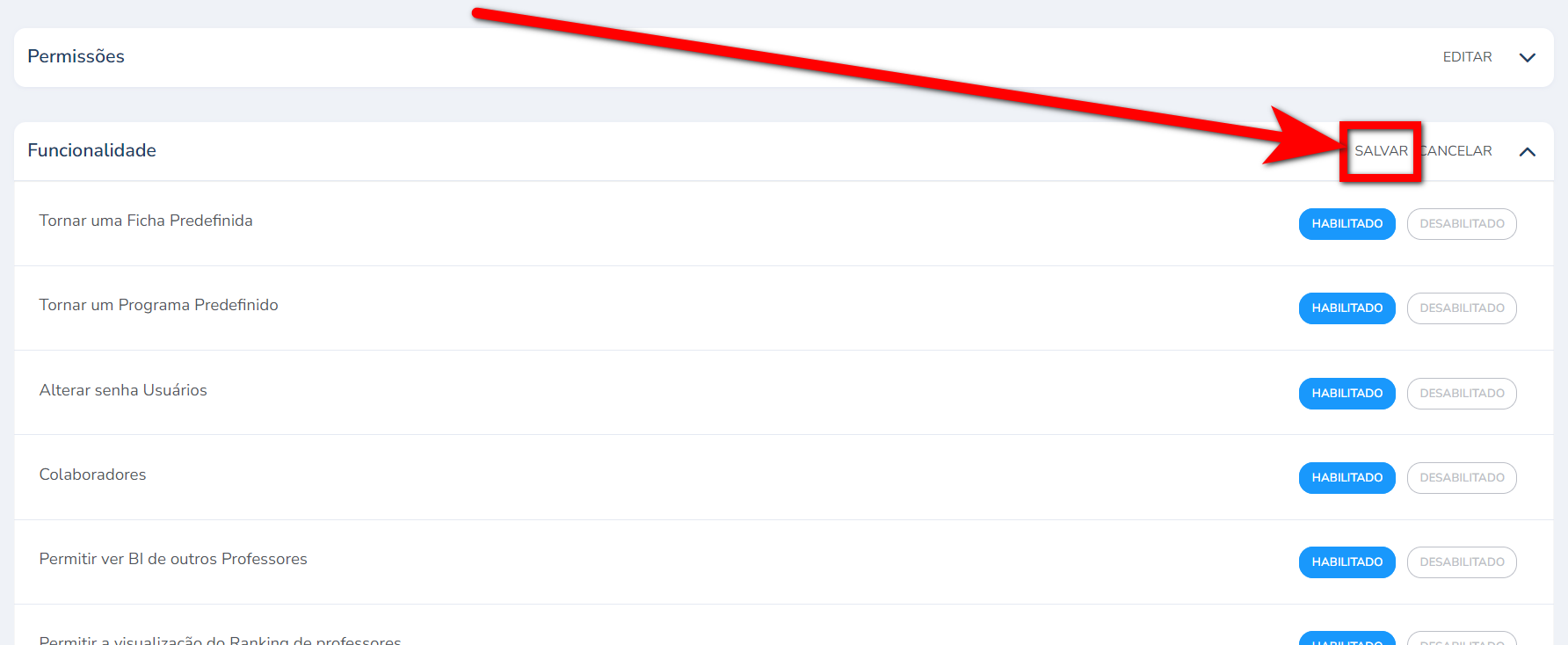 Para saber como alterar as permissões associada a ferramenta Perfil de Acesso do Treino, clique aqui.