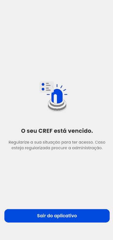 Ao habilitar a permissão e o colaborador tentar acessar o aplicativo, será apresentada a mensagem e assim não permitirá o acesso do professor ao aplicativo até que ele renove a data de vencimento do CREF.