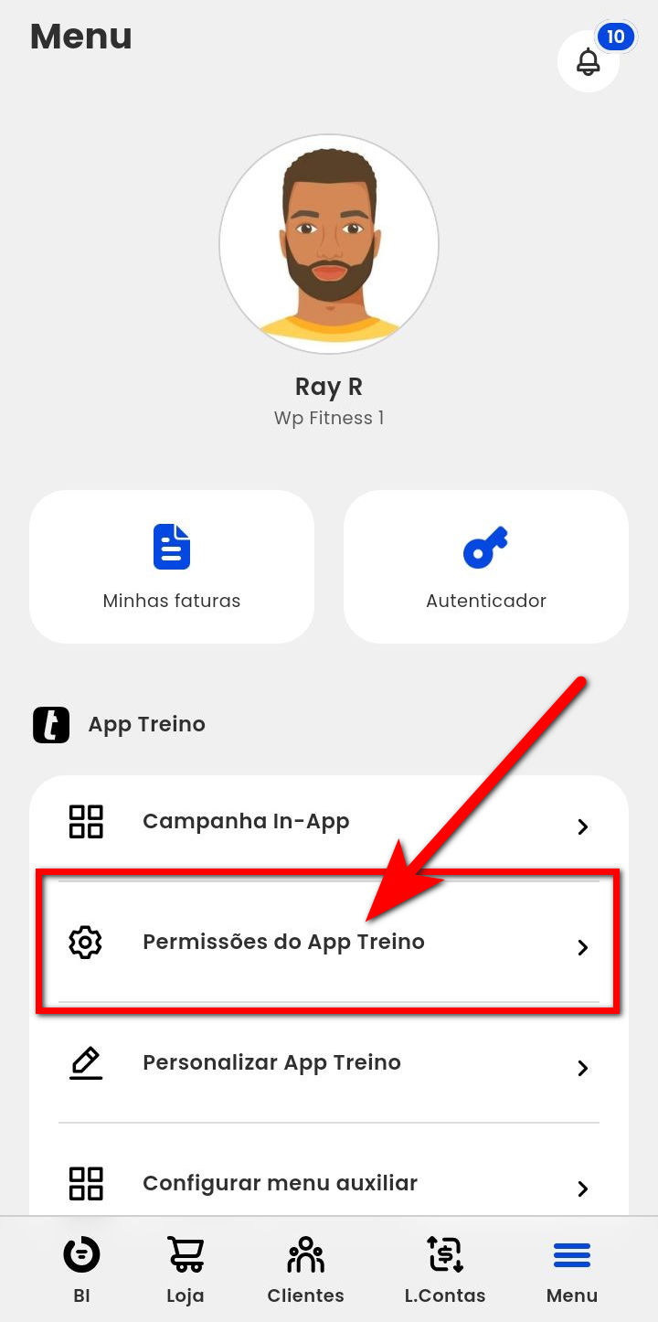 2. Na tela, clique em "Permissões do App Treino";