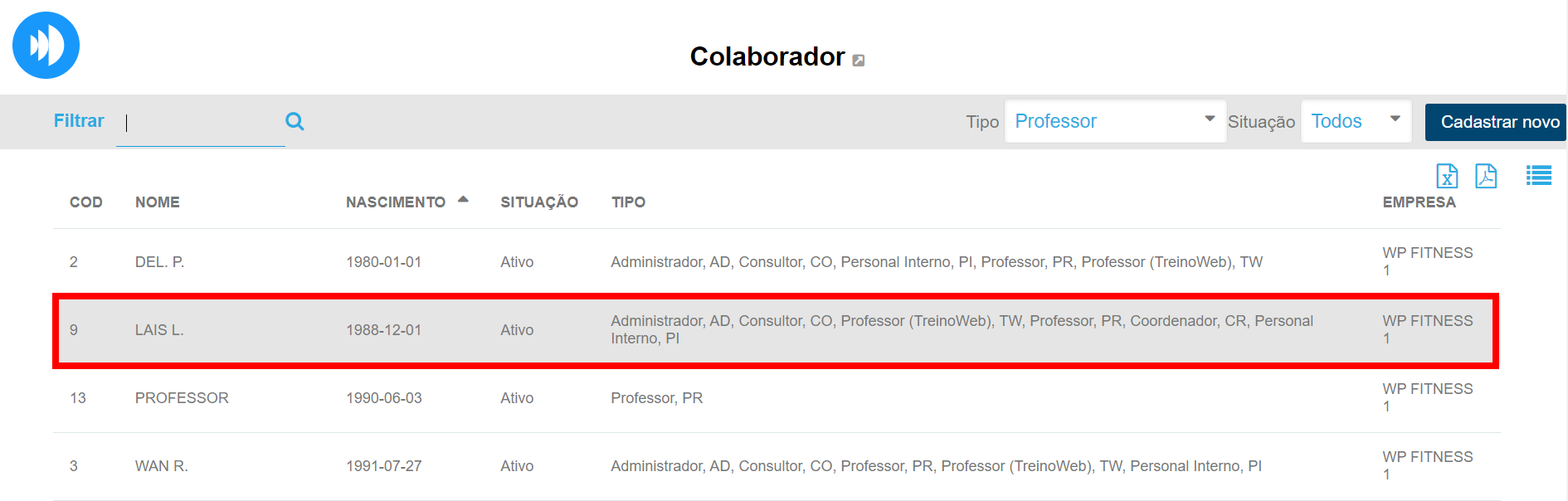 2. Em seguida, clique sobre o colaborador que deseja incluir os dados do CREF;