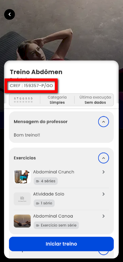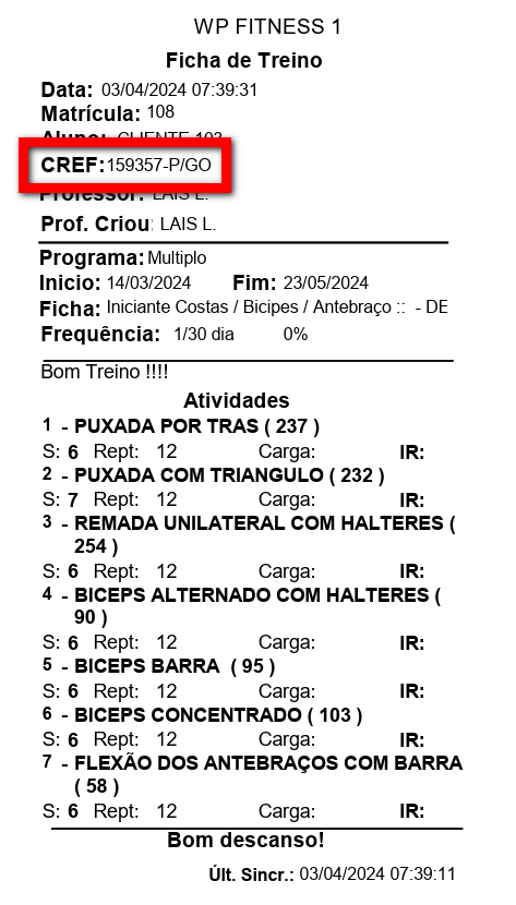 Observação: o CREF apresentado na ficha de treino do aluno, é do professor vinculado ao aluno.