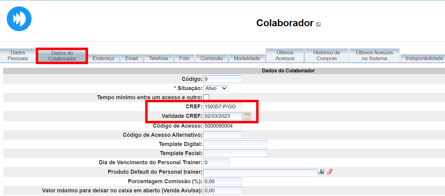 3. Na guia “Dados do Colaborador“, localize e preencha os campos;