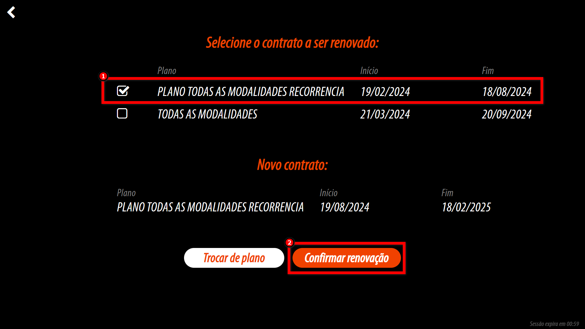 2. Será apresentada a tela de renovação. Caso a empresa utilize a configuração de contratos concomitantes e o aluno tenha mais de um plano ativo, serão apresentados os planos para o aluno escolher qual deseja renovar. Após selecionar o plano deve clicar em "Confirmar renovação";