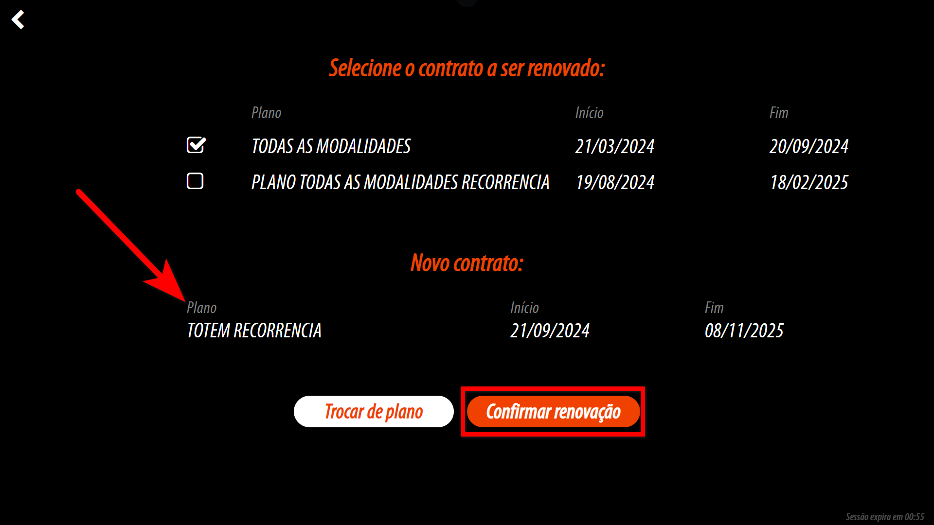 6. Logo será retornado para a tela de renovação, confirme se o plano selecionado está sendo apresentado e após clique em "Confirmar renovação";