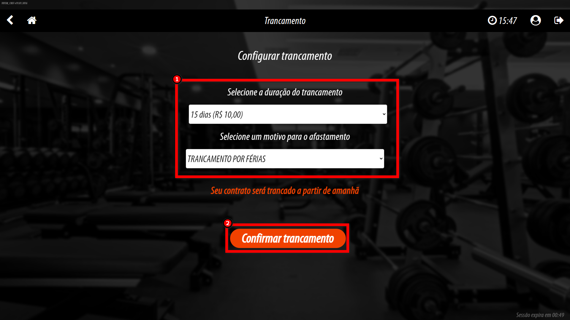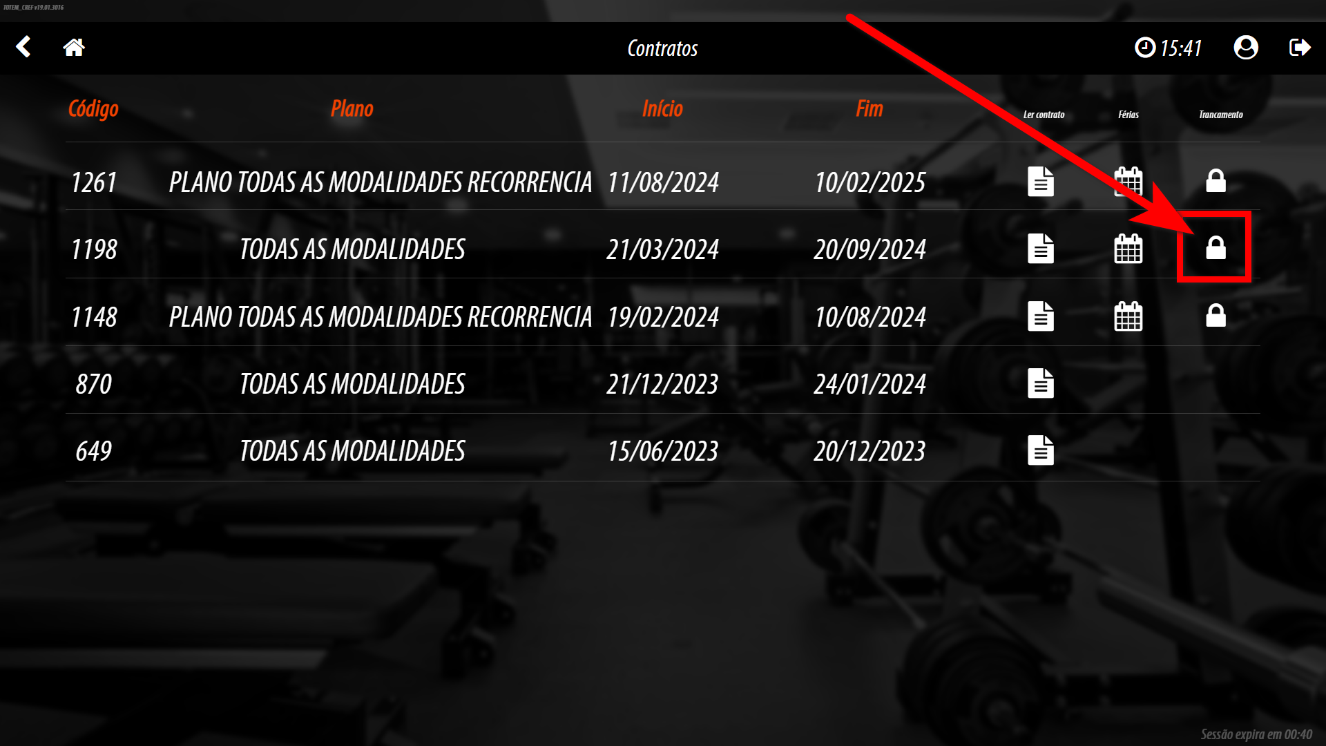 localizado a frente do contrato que deseja realizar o trancamento;
