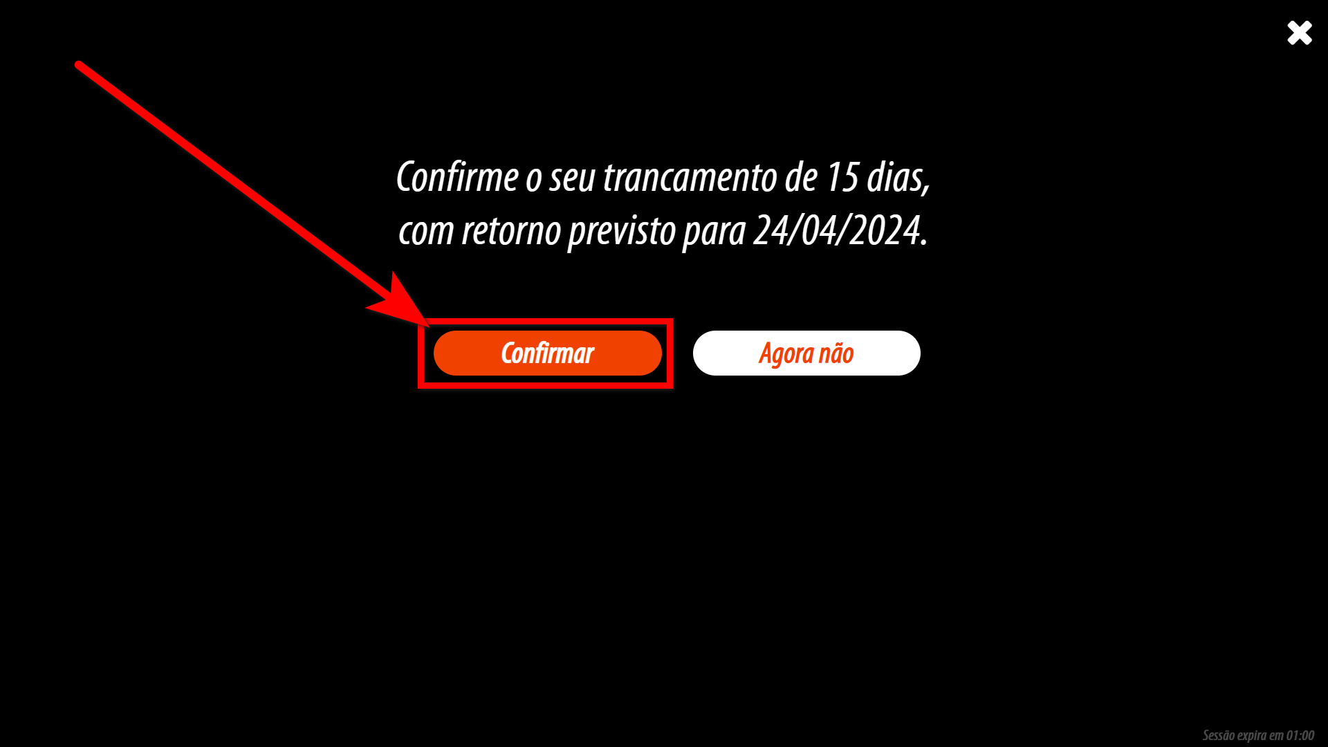 5. Após clique em "Confirmar trancamento"; 6. Será apresentada a tela onde consegue visualizar a quantidade de dias do trancamento e o dia de retorno do trancamento. Clique em "Confirmar"; Atenção: o trancamento será realizado no dia seguinte ao da solicitação, conforme mensagem apresentada na tela de confirmação.