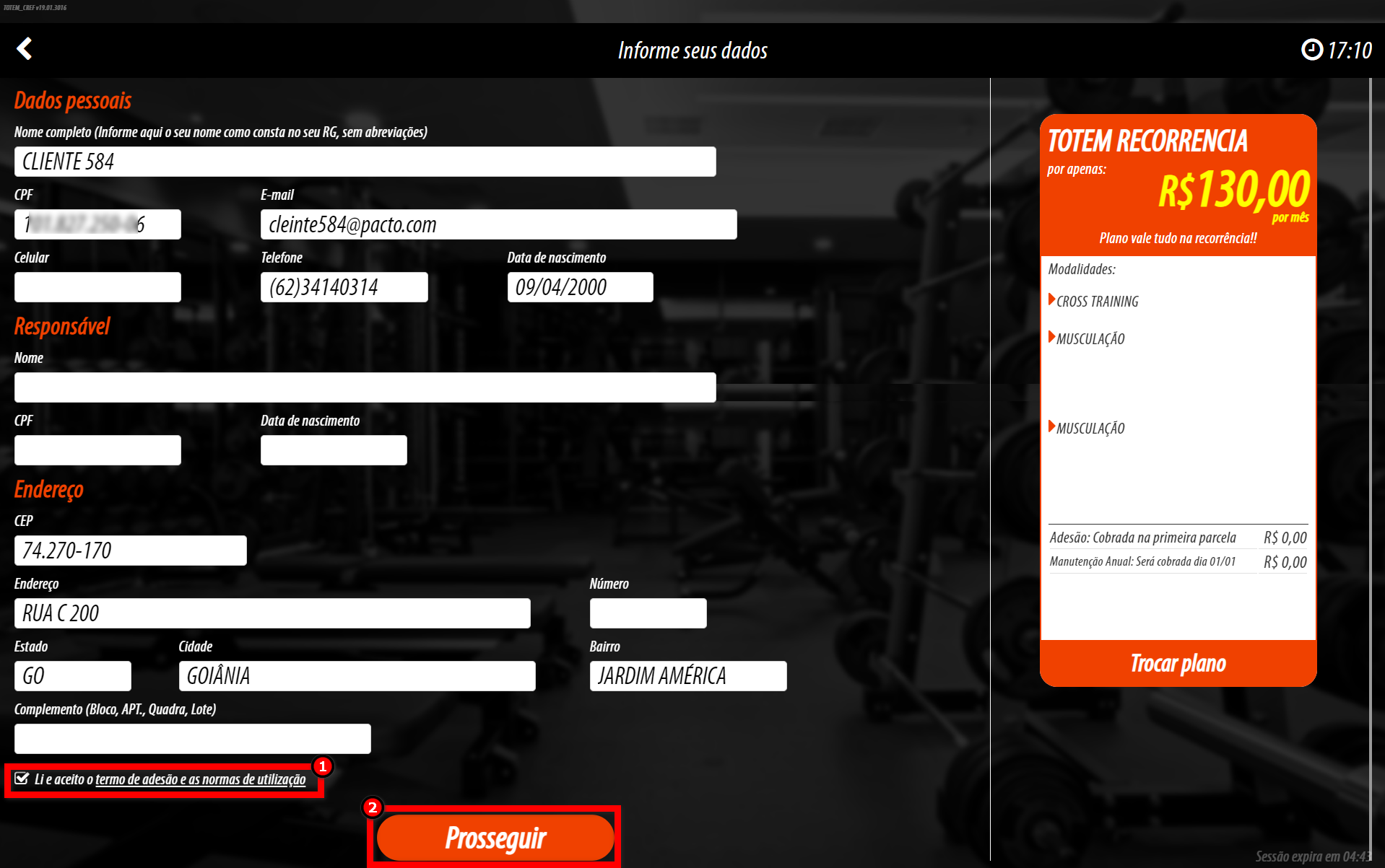 4. O cliente deve preencher os campos com seus dados, marcar a opção "Li e aceito o termo de adesão e as normas de utilização" e após clicar em "Prosseguir";